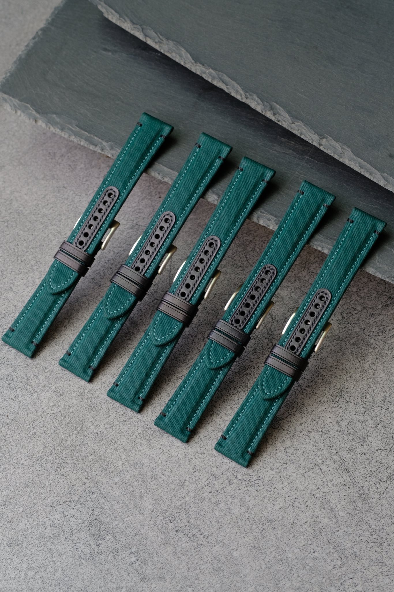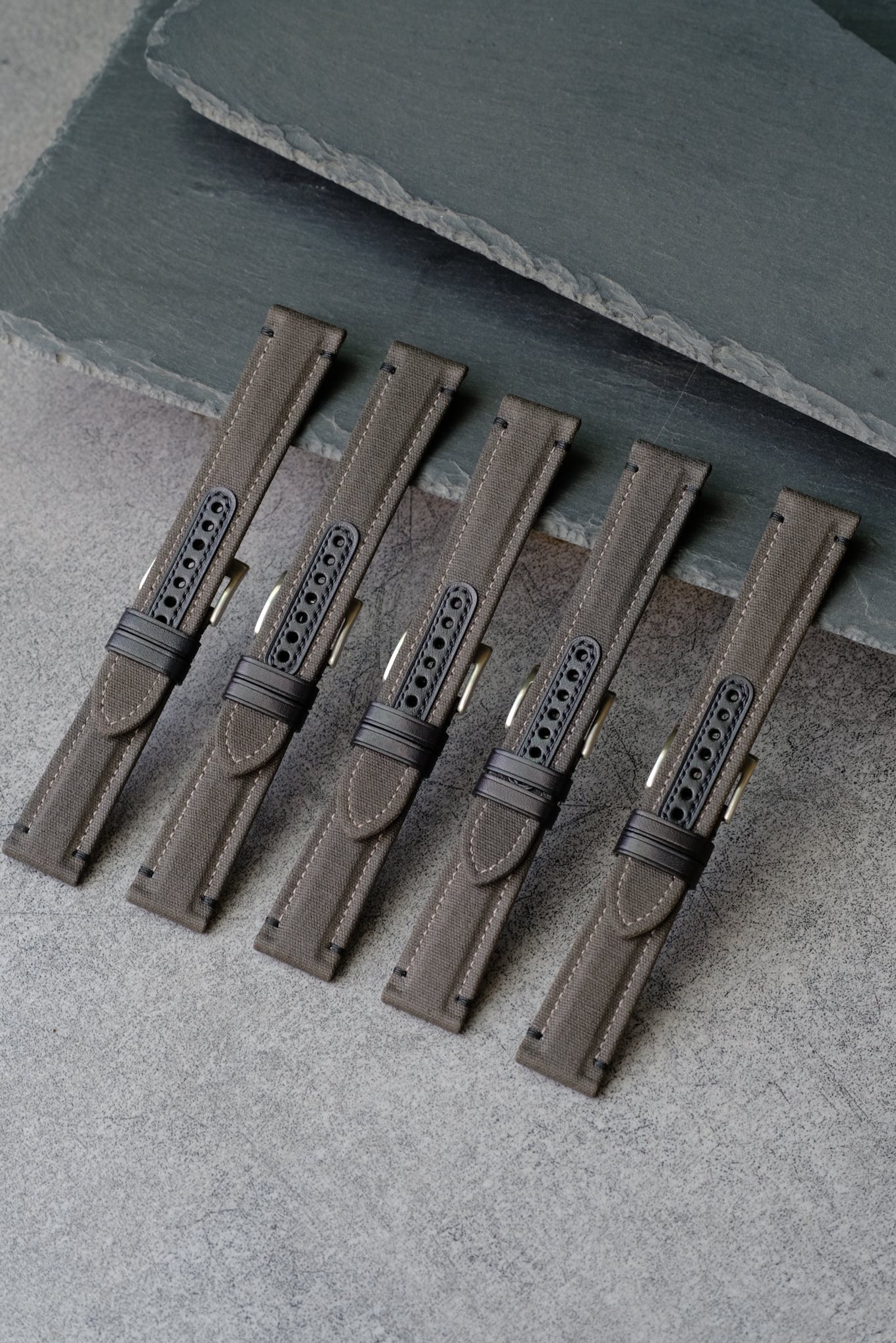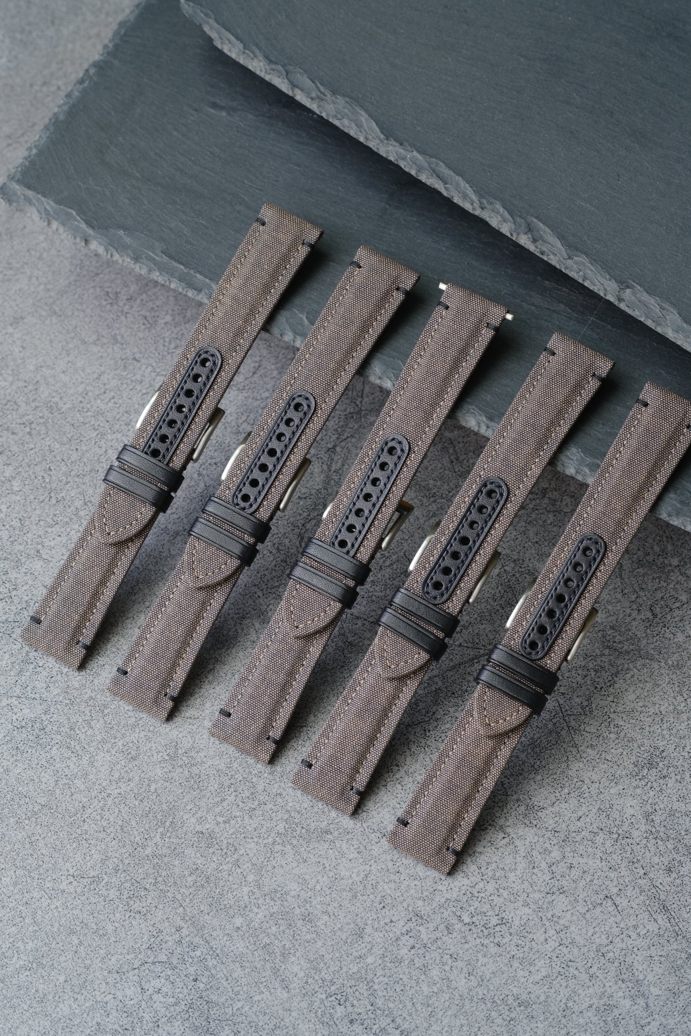 • Detta klockarmband är tillverkat av slitstarkt Aero Canvas (vävd nylon), fodrat med mjuk Alcantara Velour och har ett robust spänne i polerat 316L rostfritt stål.