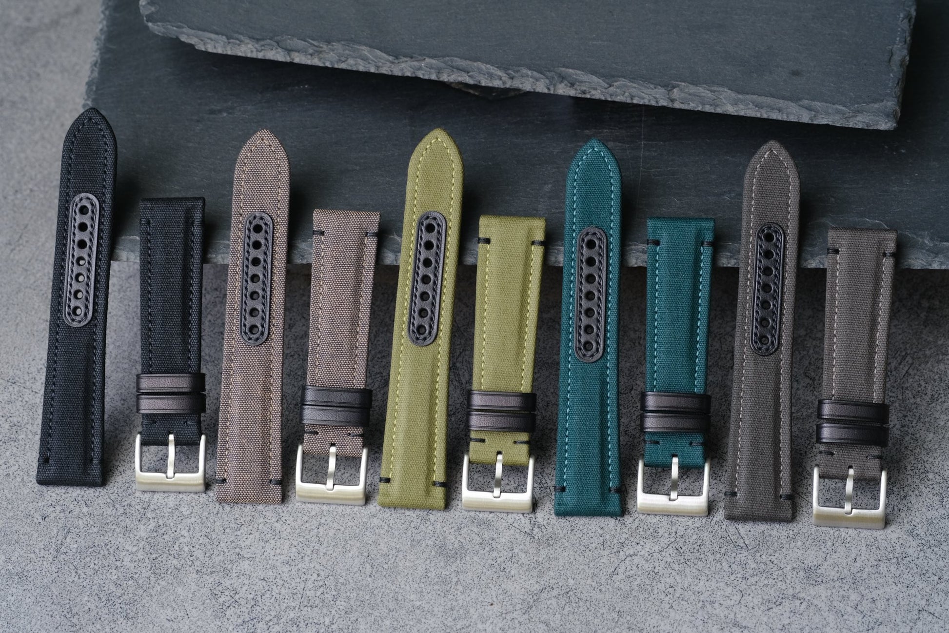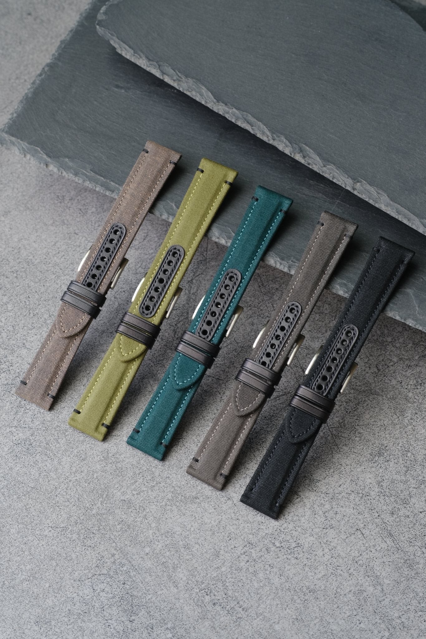 • Detta klockarmband är tillverkat av slitstarkt Aero Canvas (vävd nylon), fodrat med mjuk Alcantara Velour och har ett robust spänne i polerat 316L rostfritt stål.