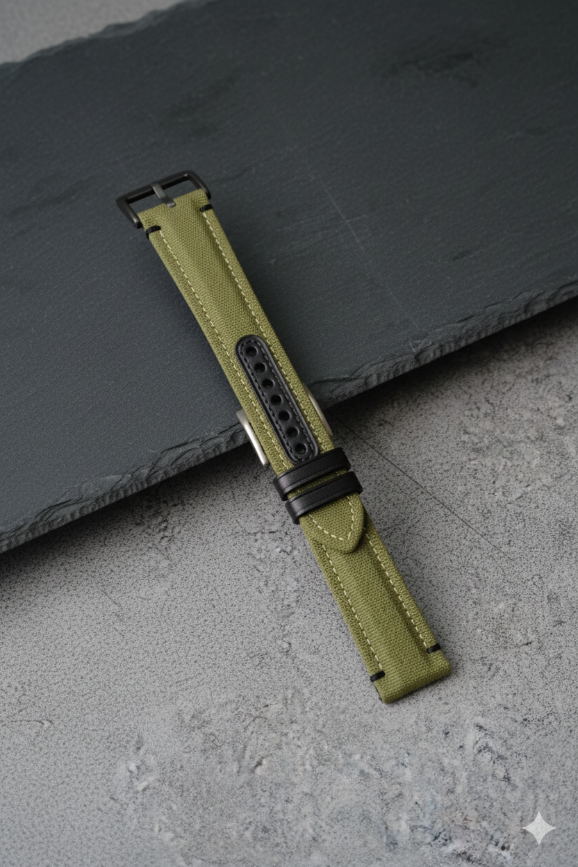 Olive Drab Aero Canvas Strap kombinerar taktisk estetik med raffinerad minimalism. Tillverkad av slitstark canvas i en dämpad militärgrön nyans, erbjuder detta armband en diskret sofistikering utan att kompromissa med prestandan. Dess strömlinjeformade design passar både funktionella och moderiktiga tillämpningar och erbjuder mångsidighet för både avslappnade och eleganta stilar. Remmen är byggd för pålitlighet och behåller sin strukturerade integritet samtidigt som den förblir lätt och bekväm. Perfekt för dig som uppskattar kulturarvsinspirerad design med modern återhållsamhet.