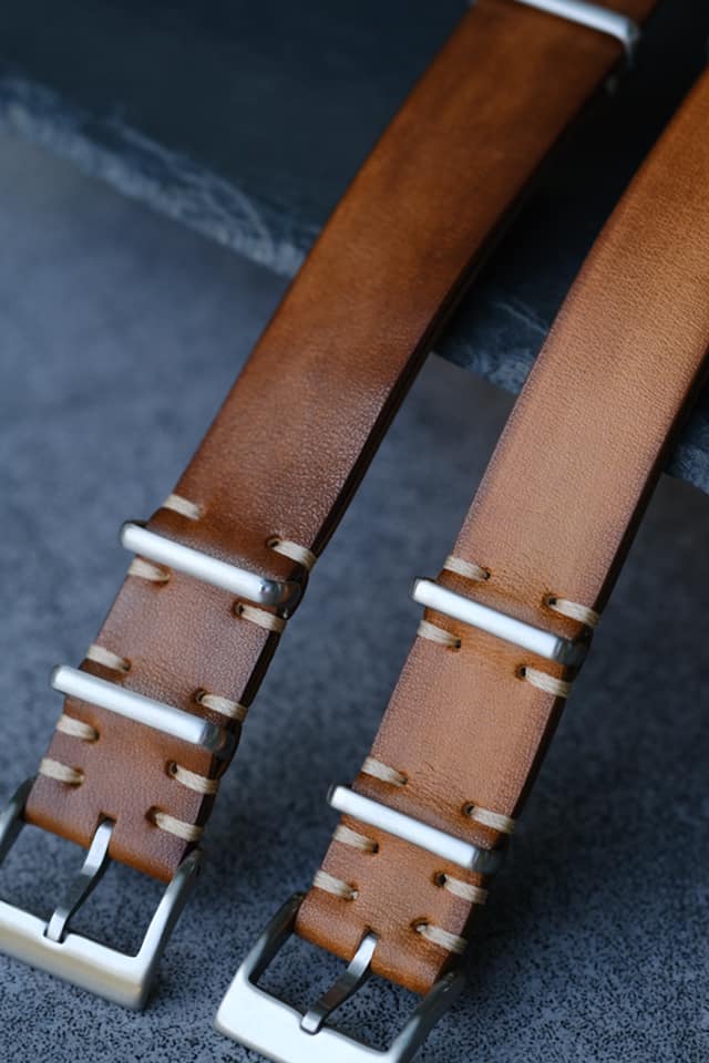 Premium kalvskinn används som råmaterial och är behandlat med en naturlig, vegetabilisk garvningsmetod. Detta säkerställer hållbarhet samtidigt som lädret tillåts patineras graciöst över tid, vilket ger varje armband unik karaktär. Den noggrant polerade ytan ger en subtil, förfinad glans som skapar en elegant estetik för både klassiska och moderna stilar.