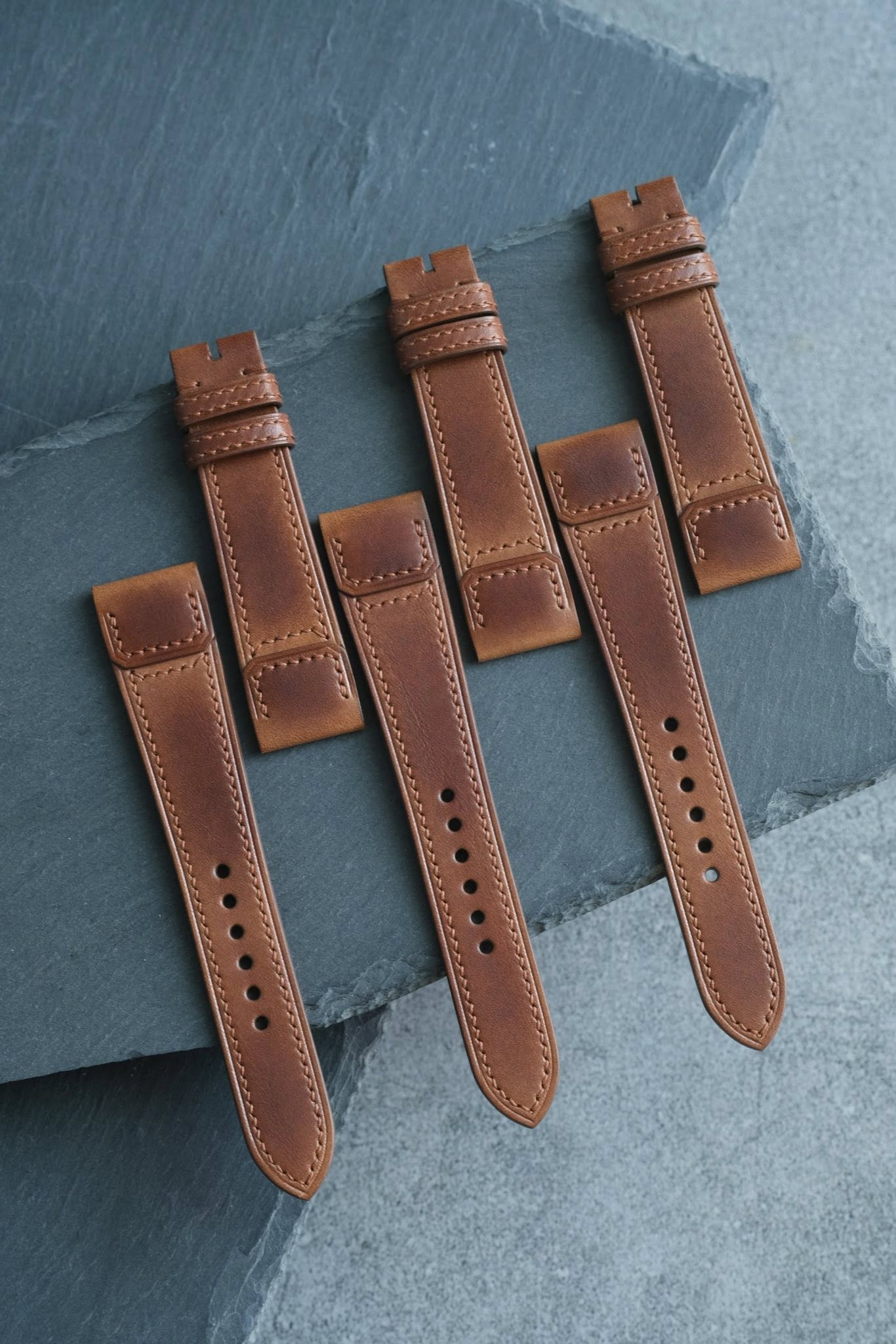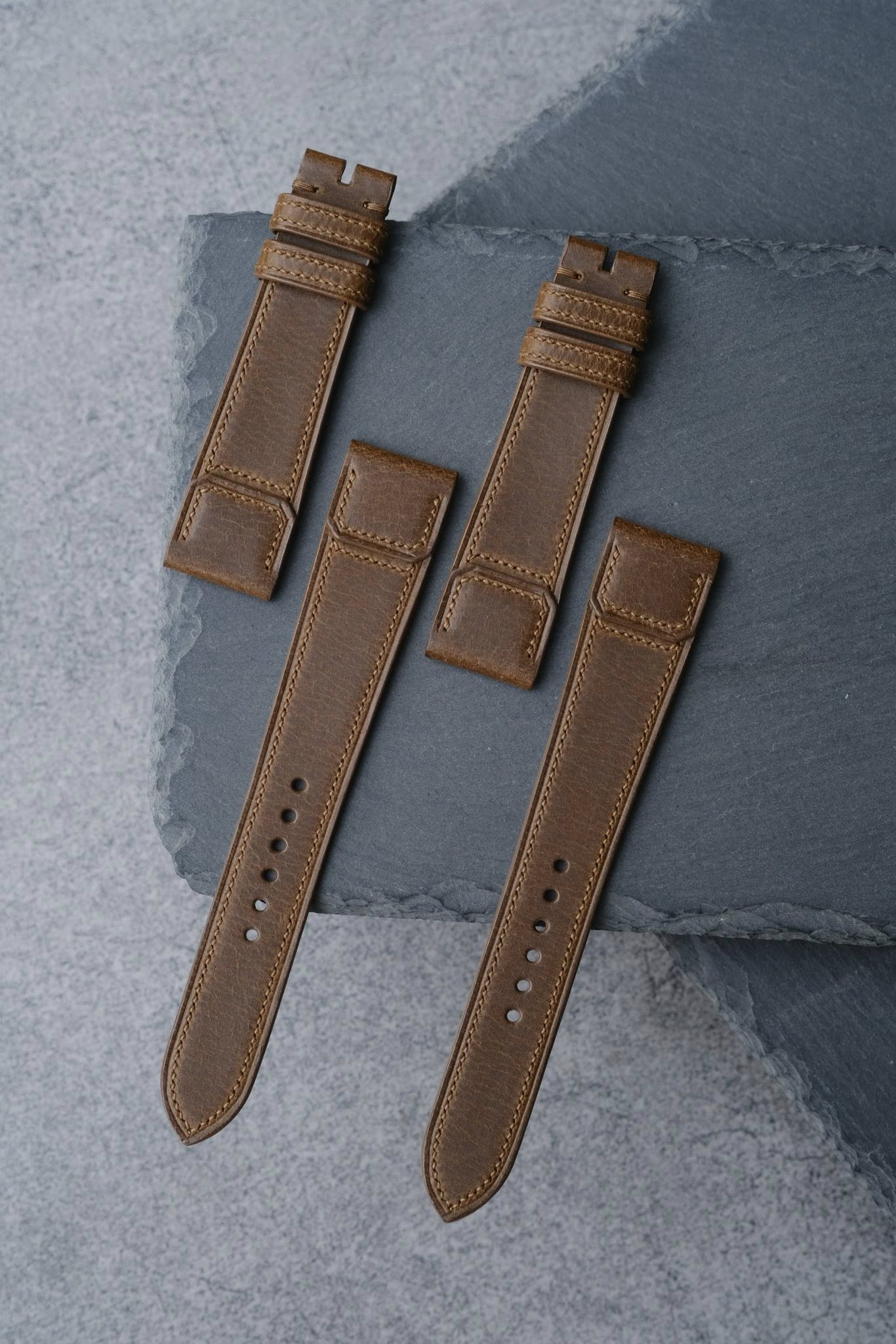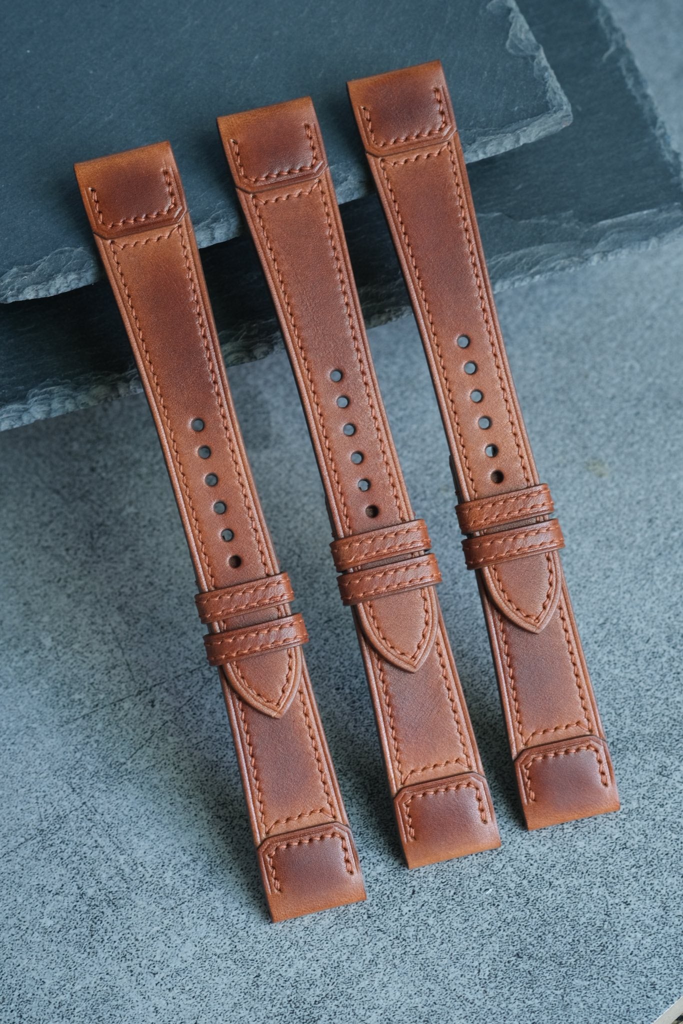Detta läderarmband har en elegant avsmalnande bredd, vilket innebär att det är tunnare vid spännet än vid anslutningen till klockan (boettfästet), enligt följande: